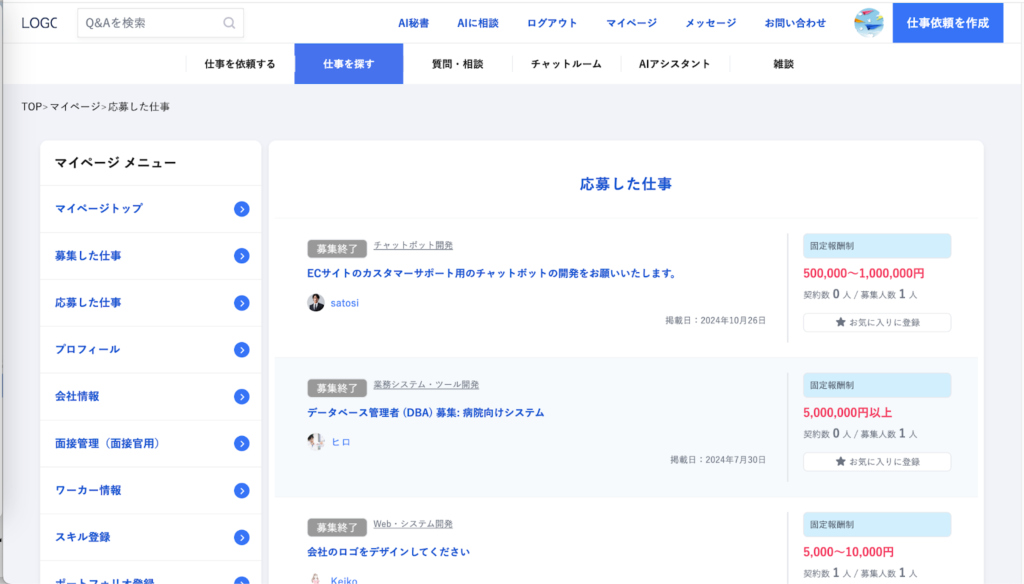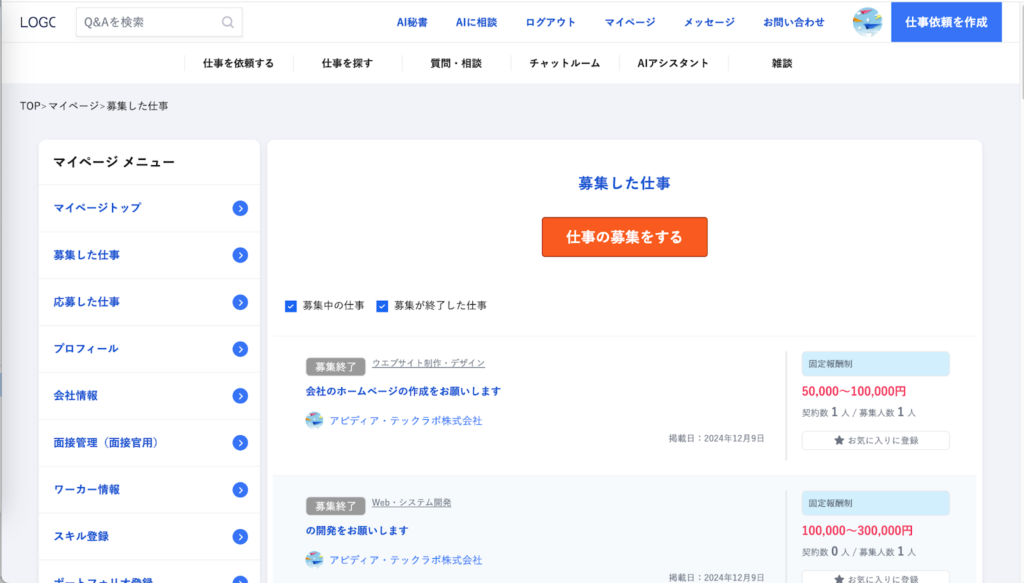 仕事発注者の管理画面:募集した仕事一覧