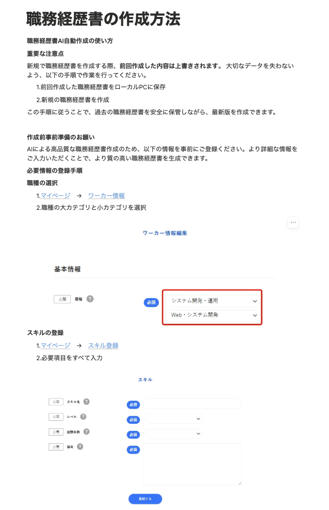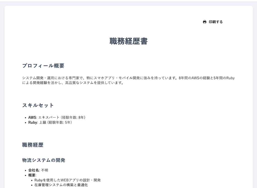 - ワーカーの登録スキル・ポートフォリオ情報を解析し、自動で職務経歴書を生成