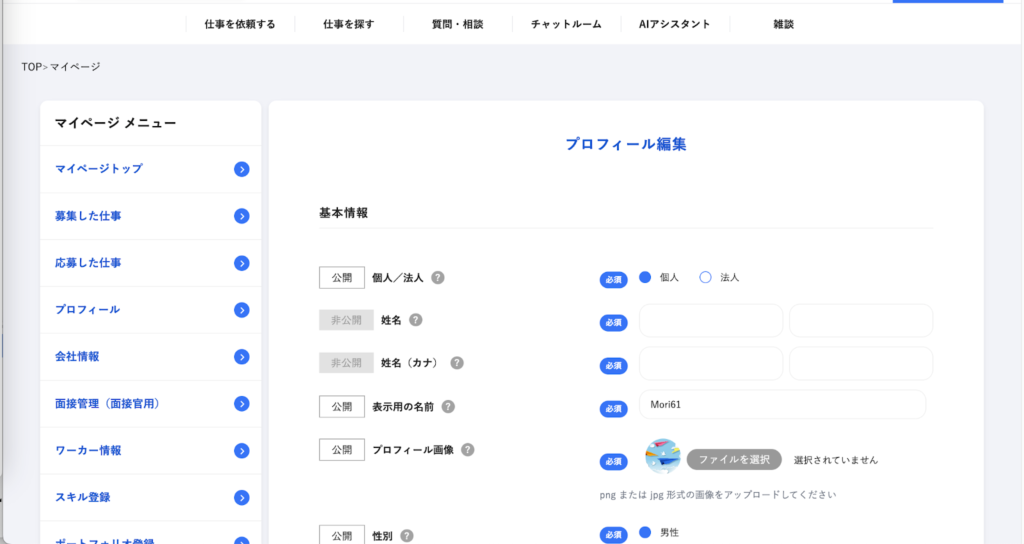 ワーカーさんのプロフィール編集画面