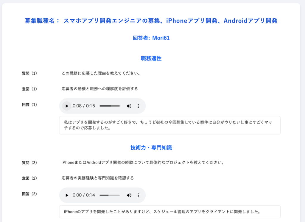 【面接官の管理画面】ワーカーさんの回答確認画面(音声も文字もこのページで確認可能)