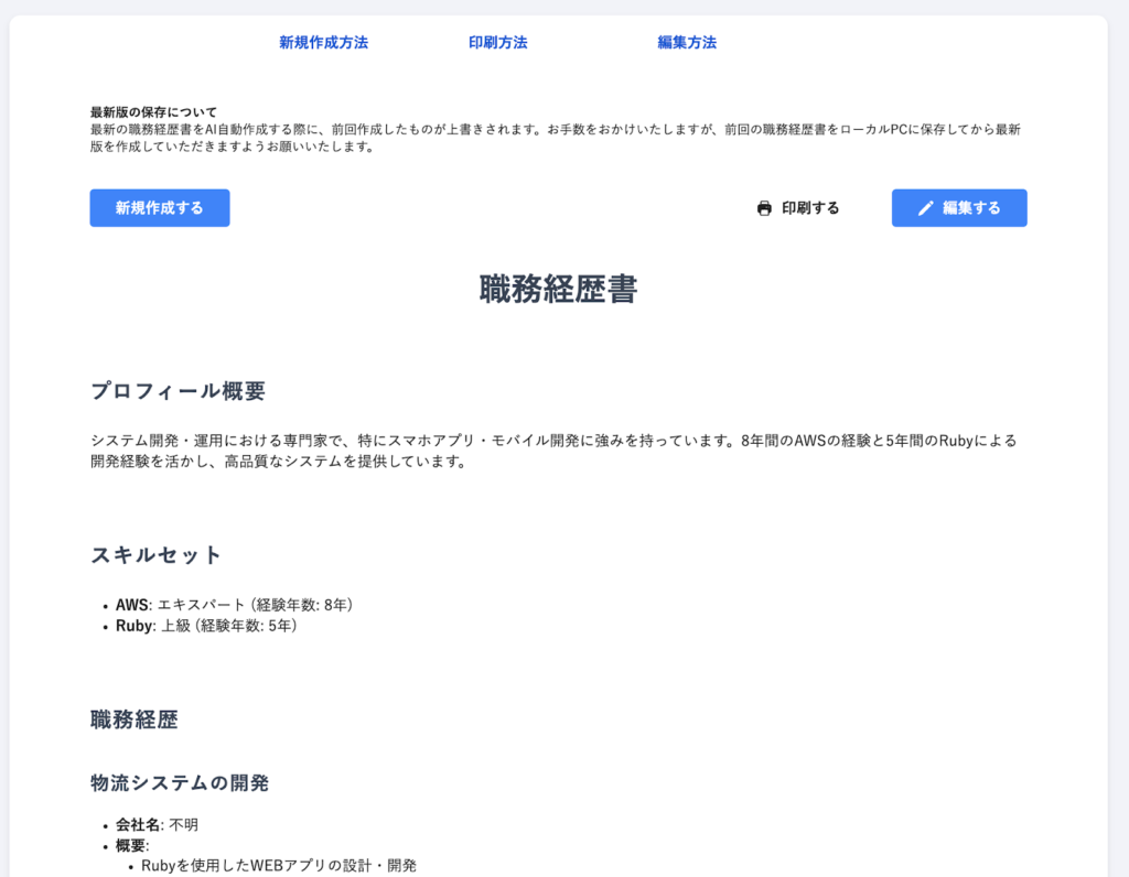 自動的に作成した職務経歴書
