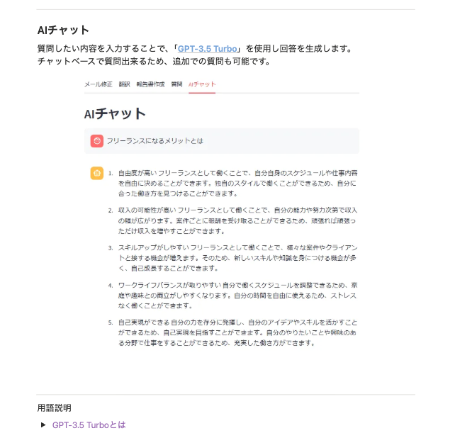 | AIチャット | 業務相談や作業支援 |