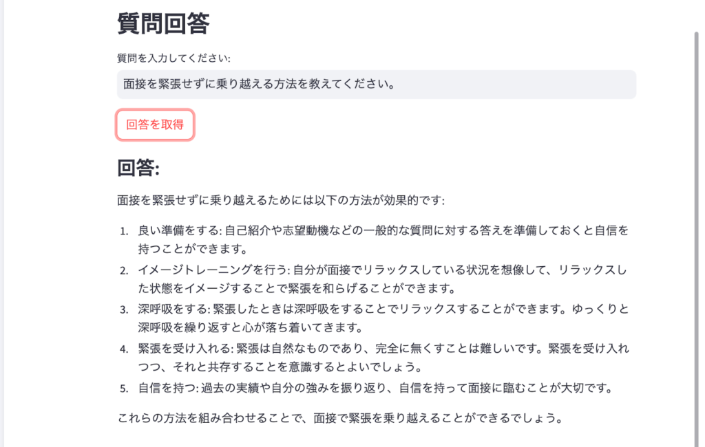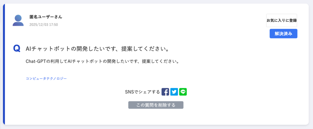 質問と回答の画面(最初の1つ目はAI回答です)