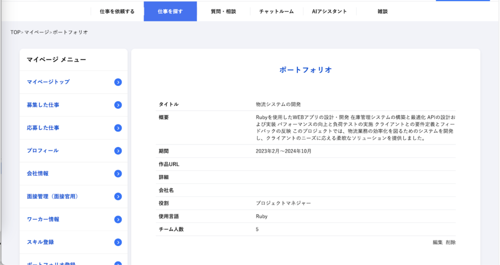 ワーカーさんのポートフォリオ編集画面