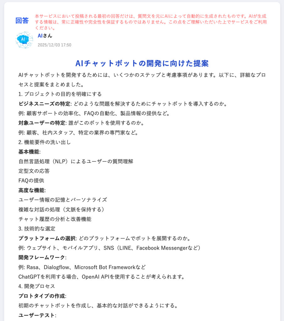 - 初回回答はAIが自動生成するため、誰も回答しなくても有用な助言を得られる